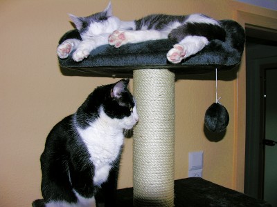 Feli und Hope Hiermit möchten wir Ihnen verspätet mitteilen, dass es unseren beiden Katzen Feli (ehemals "Margeaux") und Hope gut geht. Die Verspätung ergab sich auf Grund des Umzuges nach Halle. Hier haben sich die Beiden gut eingelebt und sich unerwartet gut mit dem bereits vorhandenen Hund verstanden. Sie werden weiterhin wie vereinbart als Wohnungskatzen gehalten und wissen wie Sie uns mit ihrer liebevollen, jedoch auch frechen Art um den Finger wickeln und somit stets im Mittelpunkt stehen. Anbei senden wir Ihnen ein Foto von den Beiden auf ihrem neuen Kratzbaum. (Vermittelt am 23.09.2003) |